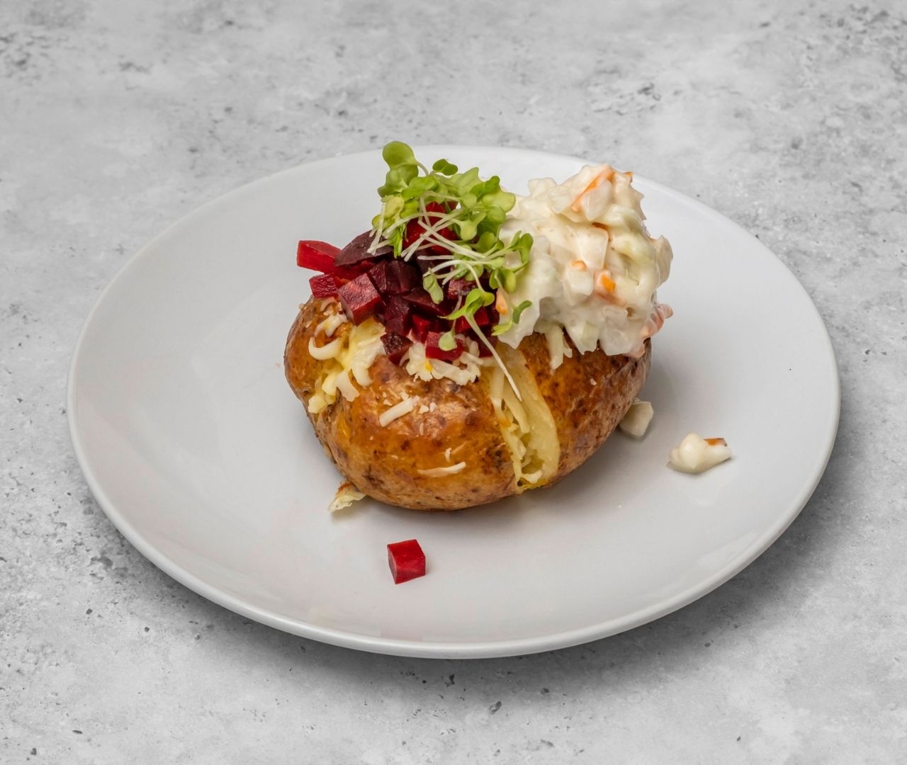 Fluffy jacket potato topped with tuna mayo, mozzarella,