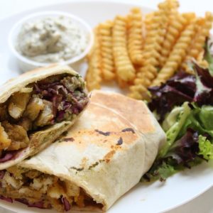 Juicy marinated chicken wrapped with tomato, gherkin pickles, red